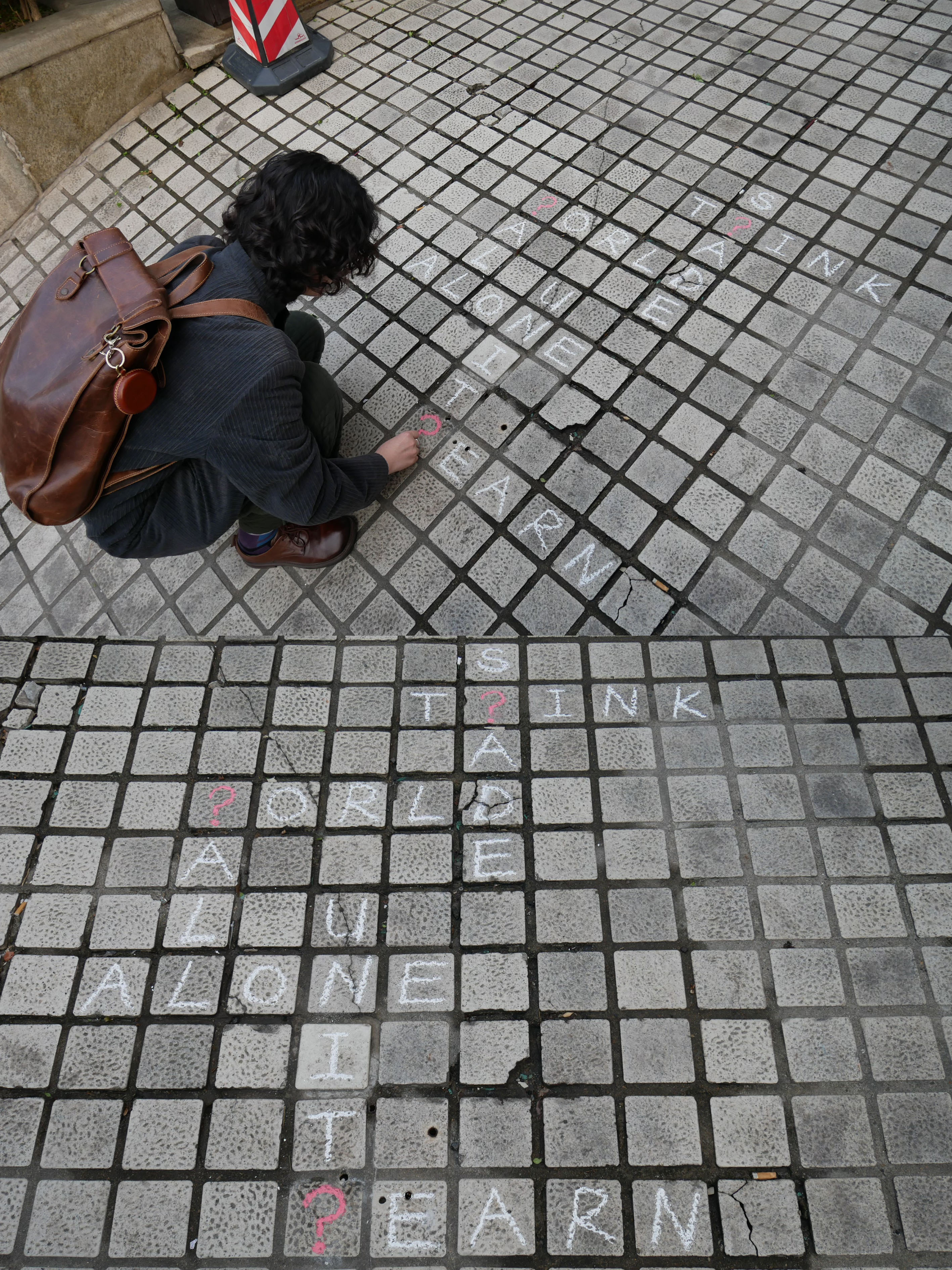 规则:拿一支粉笔在城市街道上漫步,观察周围,寻找环境中可以互动的元素,并用粉笔进行微小的改造。